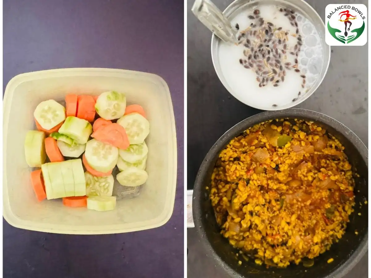 Flaxseed buttermilk and the raw salad helps to sooth his gut, reduced acidity, bloating, and constipation. All this will help his digestion reset and reduce abdominal fat over time.