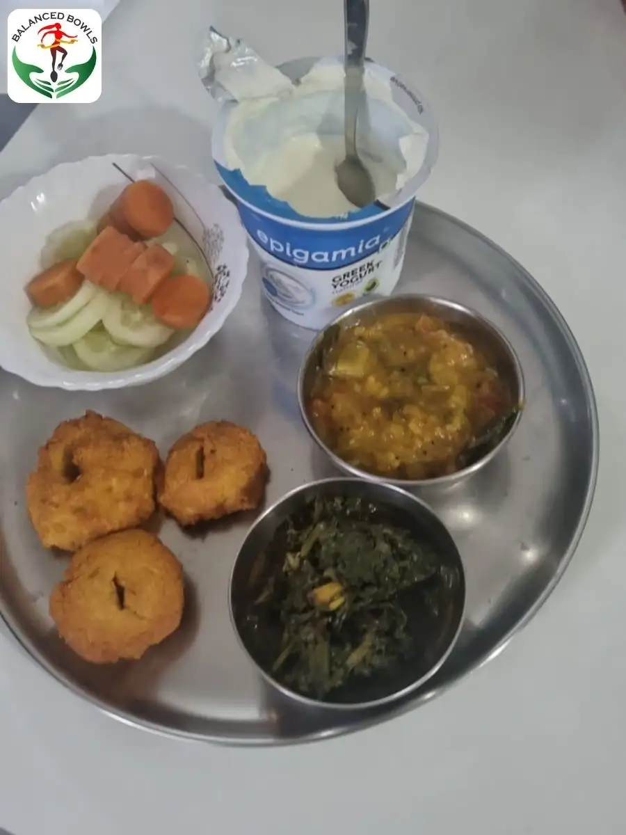 • Salad + Greek yogurt + GLV + Low carb Medu Wada + thick sambar with vegs