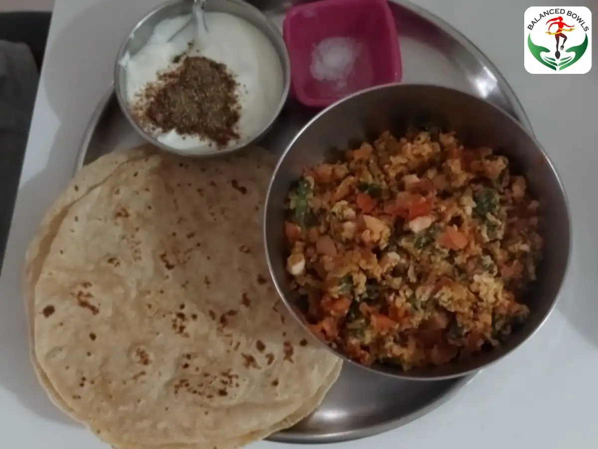 • Wheat rotis + Tofu Egg mixed bhurji with lots of veggies + Greek yogurt with flaxseed powder